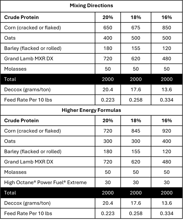We recommend feeding each lamb 1/4 flake of a good quality hay per day along with the below show lamb feeds. Feed these amounts of the below feeds for every 10 pounds of body weight to provide 22.7 mg Decoquinate per 100 pounds body weight daily.