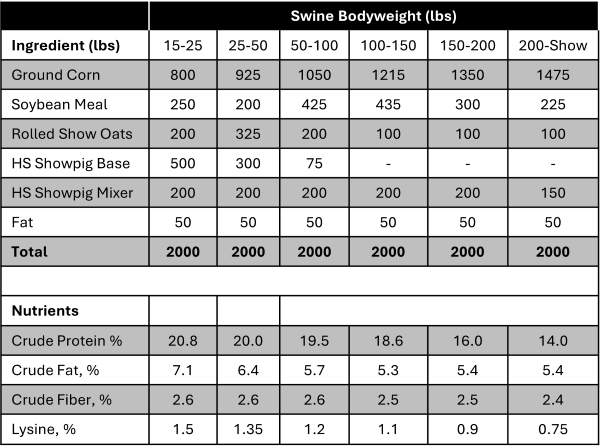Mix Honor® Show Showpig Base thoroughly with ground corn, soybean meal and other desired ingredients to manufacture show pig feeds. If a medicated feed is desired, add medication at the expense of corn.